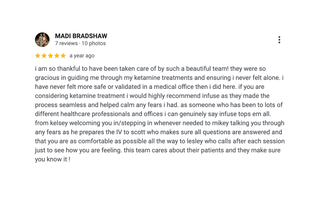 Ketamine Therapy has been proven to produce rapid antidepressive effects. Ketamine targets differs neurotransmitters in the brain than conventional SSRI’s, so many individuals who haven’t found desired results with traditional antidepressants, or prefer not to start medication, find themselves to be ideal candidates for ketamine therapy. At Infuse, we provide a supportive setting to help you rediscover hope and relief.